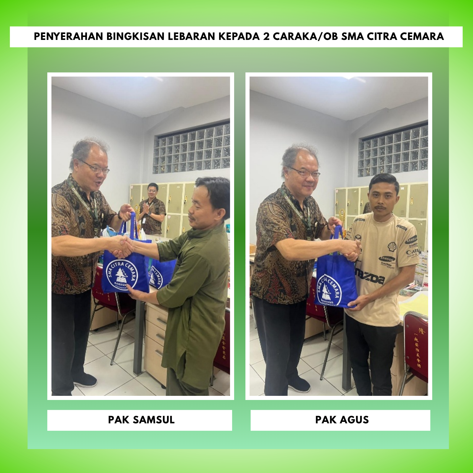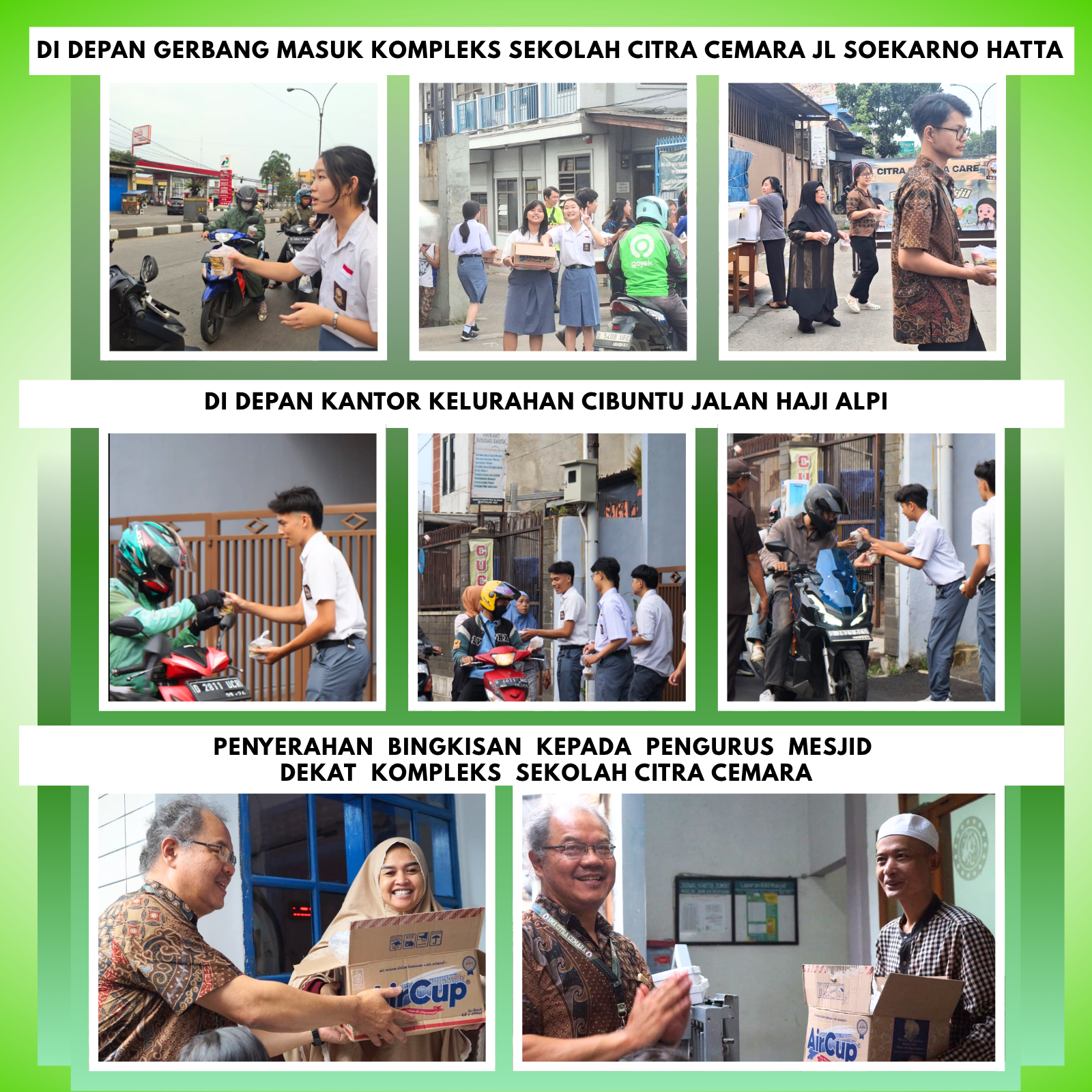 1) Di depan gerbang masuk kompleks Sekolah Citra Cemara Jalan Soekarno Hatta. 2) Di depan kantor kelurahan Cibuntu Jalan Haji Alpi 3) Penyerahan Bingkisan kepada Pengurus Mesjid Dekat Kompleks Sekolah Citra Cemara 4) Penyerahan Bingkisan Lebaran Kepada 2 Caraka/OB SMA Citra Cemara ( Pak Agus & Pak Samsul )