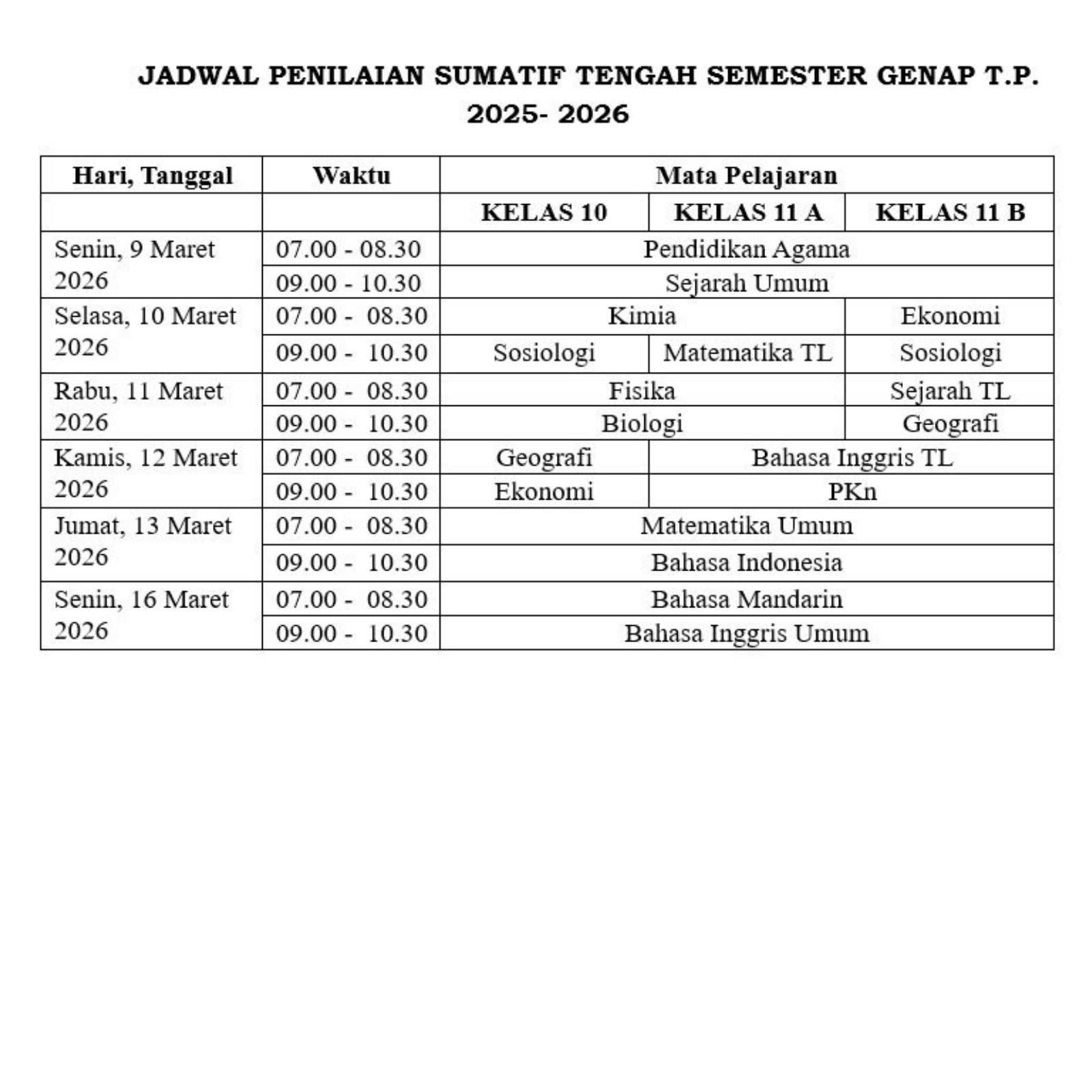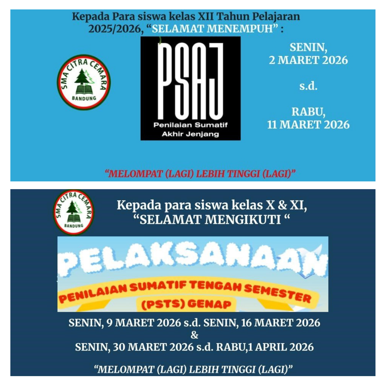 Jika para siswa kelas XII menjalani PSAJ, maka para siswa kelas X & XI Tahun Pelajaran 2025/2026 akan menjalani Penilaian Sumatif Tengah Semester Genap (PSTS Genap). Pelaksanaan PSTS Genap ini dimulai pada Senin,9 Maret 2026 s.d. Senin,16 Maret 2026. PSTS Genap pada periode ini berupa asesmen tertulis. Pada, Senin,30 Maret s.d. Rabu,1 April 2026 PSTS Genap akan berlanjut ke asesmen praktek/asesmen Kinerja.