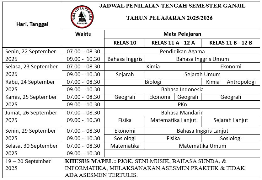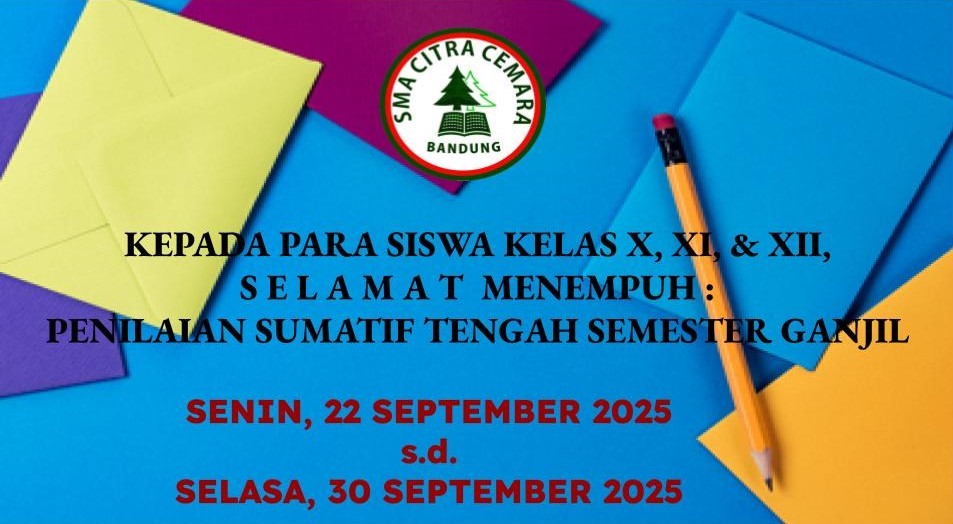 Pada Senin, 22 September s.d. Selasa,30 September 2025, SMA Citra Cemara menyelenggarakan Asesmen Sumatif Tengah Semester Ganjil pada tahun Pelajaran 2025/2026. Tepatnya, 2,5 Bulan setelah para siswa bergulat dengan pembelajaran intrakurikuler, kini saatnya sekolah melakukan evaluasi pembelajaran berupa asesmen tengah semesterganjil. Evaluasi pembelajaran ini untuk mendapatkan umpan balik atas raihan hasil belajar yang dilakukan para siswa serta perbaikan pembelajaran yang dilaksanakan oleh para guru di kelas. Perbaikan bisa berupa perubahan metode pembelajaran ataupun mengubah strategi pembelajaran yang dikelola oleh para guru, bisa juga perbaikan pada pendekatan pembelajaran yang dilakukan terhadap para siswa di kelas.