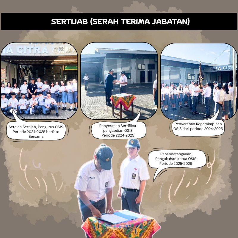 Kegiatan Serah Terima Jabatan ini dilaksanakan pada Senin, 17 November 2025 bertepatan dengan kegiatan upacara bendera rutin SMA setiap minggu ke-3 pada tiap bulannya. Kegiatan Serah Terima Jabatan dari pengurus OSIS lama periode 2024-2025 dengan ketua & wakil ketua (Ferdy & Jesse) ke pengurus OSIS baru periode 2025 -2026 dengan ketua & wakil ketua (Chevan & Kenneth).
